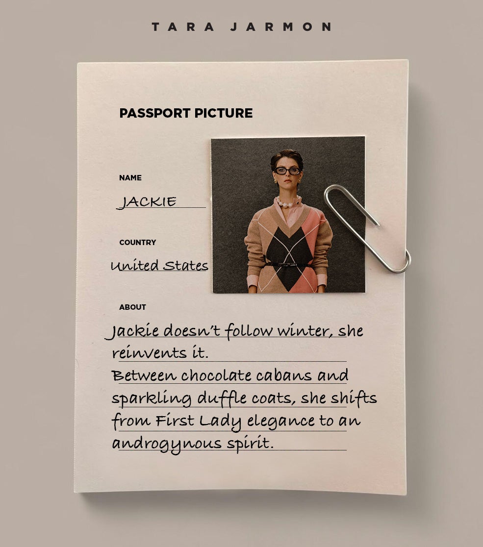 Jackie doesn't follow winter, she reinvents it. Between chocolate cabans and sparkling duffle coats, she shifts from First Lady elegance to an androgynous spirit. Taupe simplicity, tailored suits, sharp allure: a discreet yet unforgettable icon. |