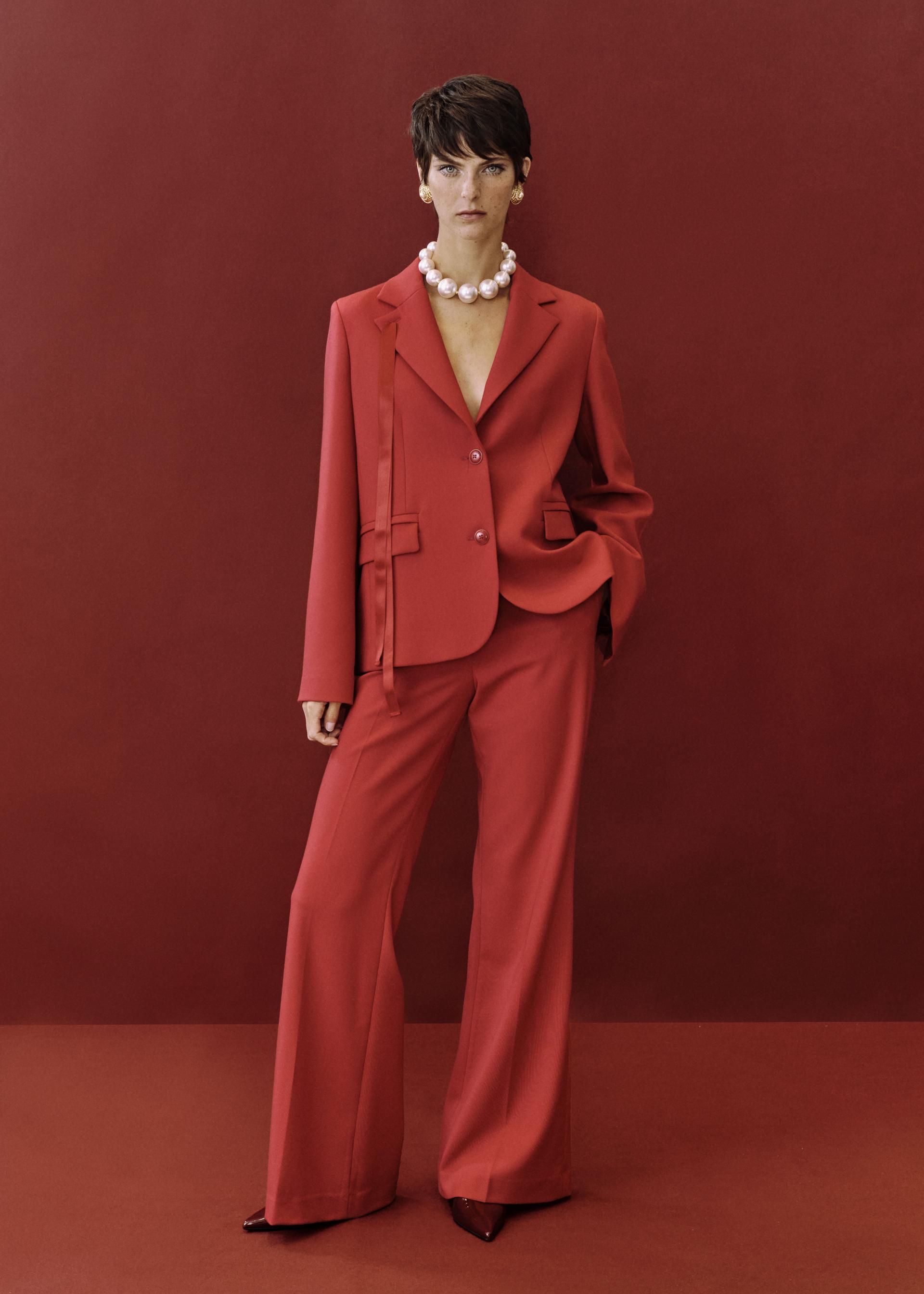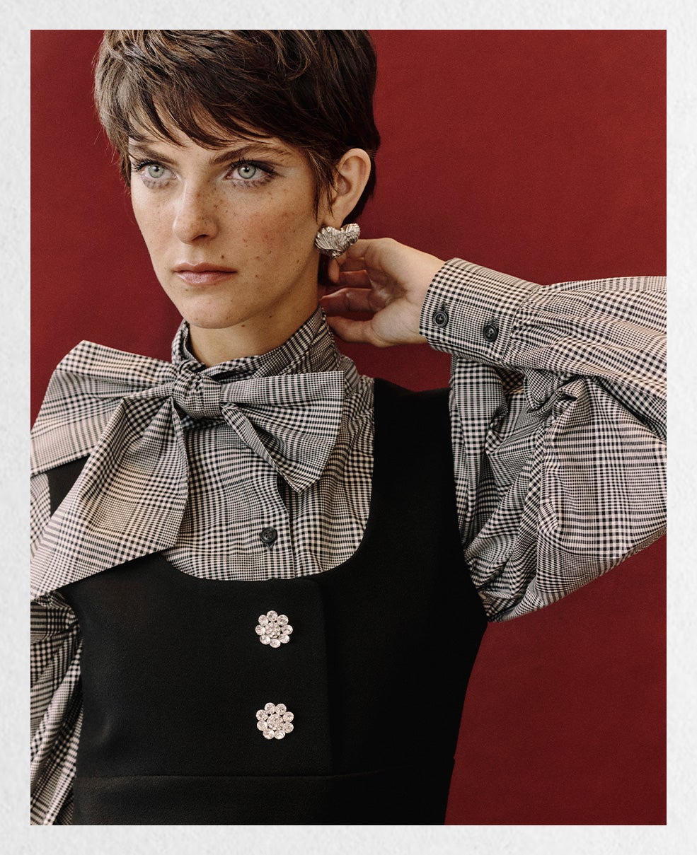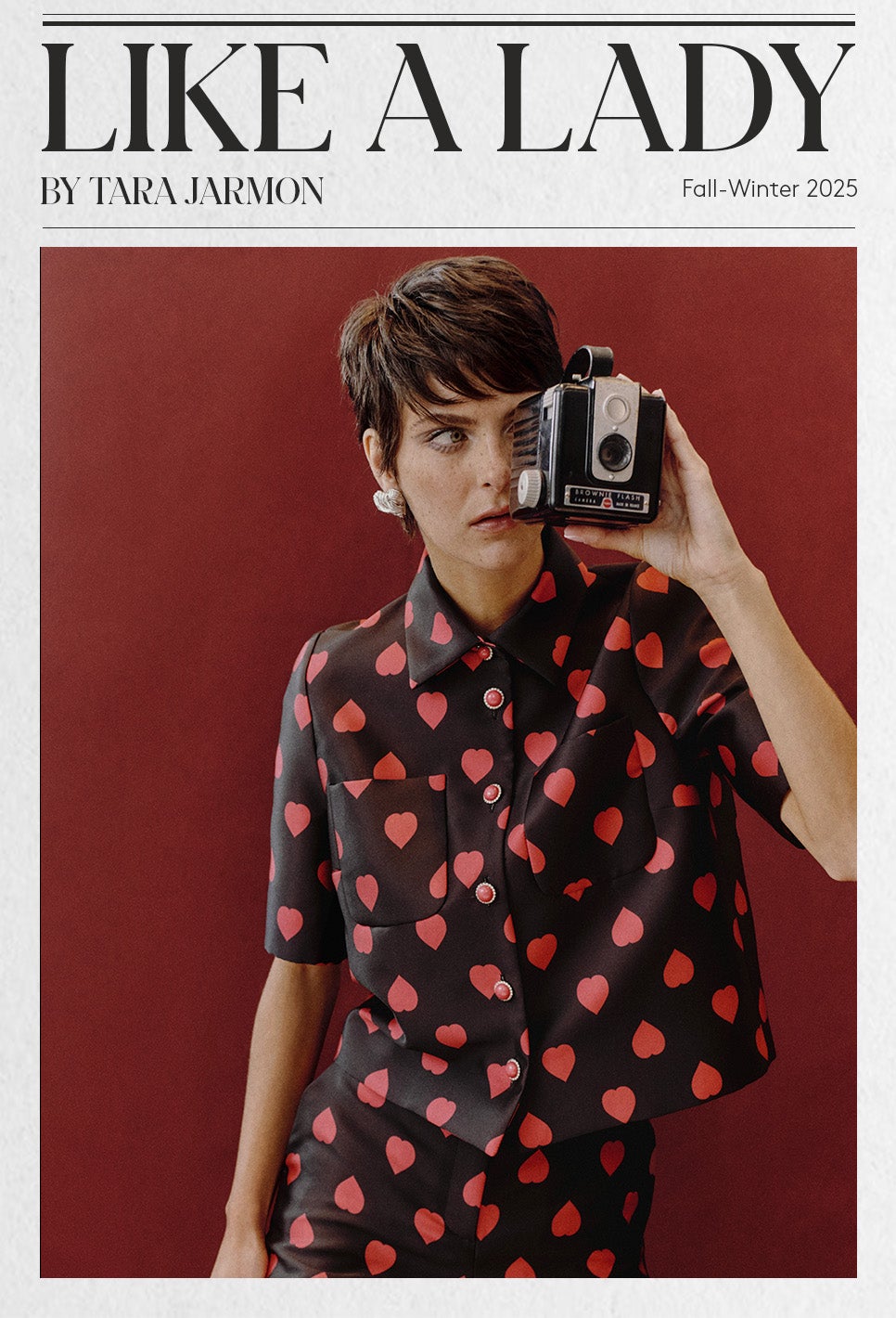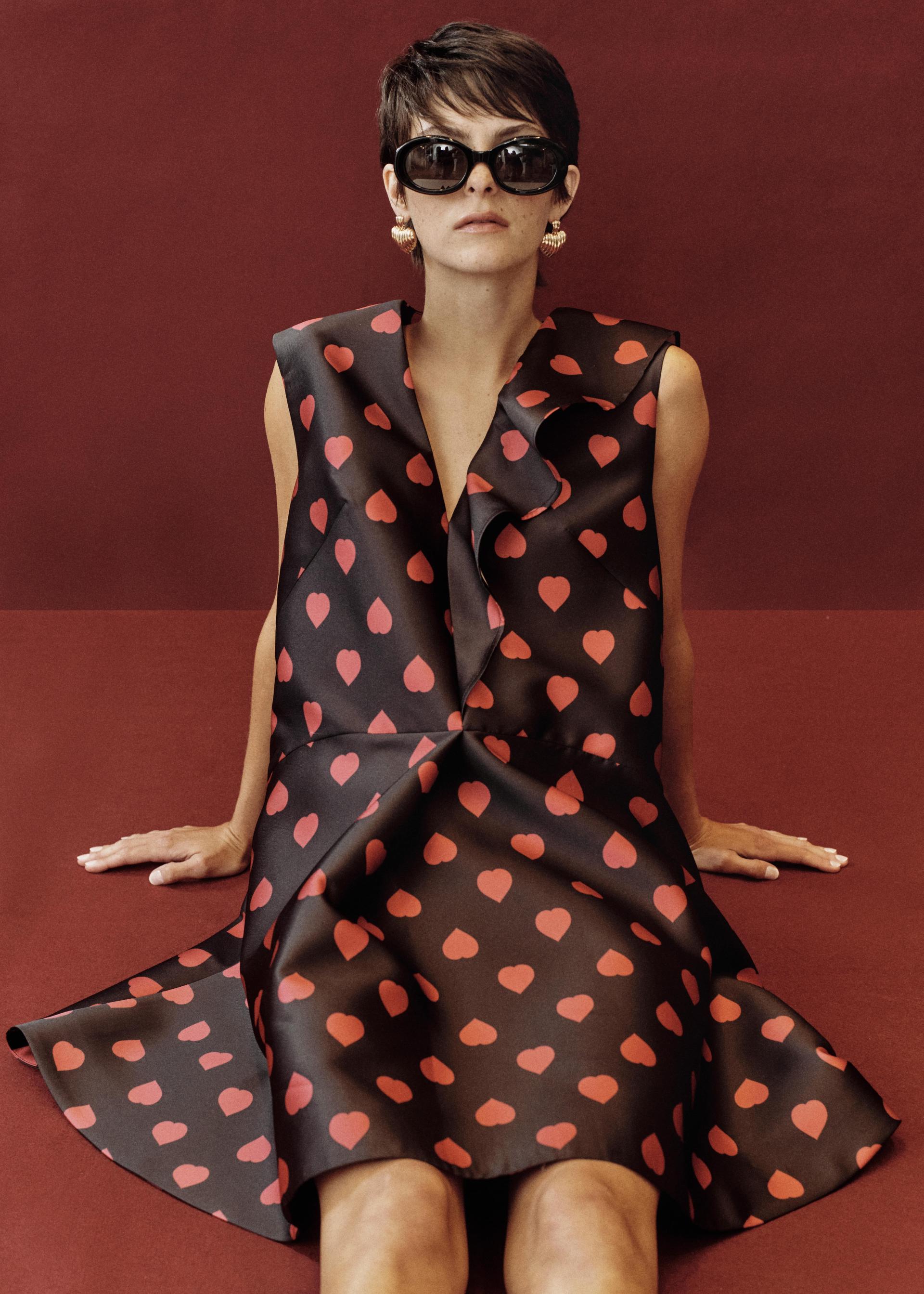 The collection celebrates timeless elegance: structured coats, feminine little black dresses, and reinvented white shirts. Knitwear plays with the contrast between day and night, while garnet tones and the Polka Hearts print add a final touch of color and romance. |