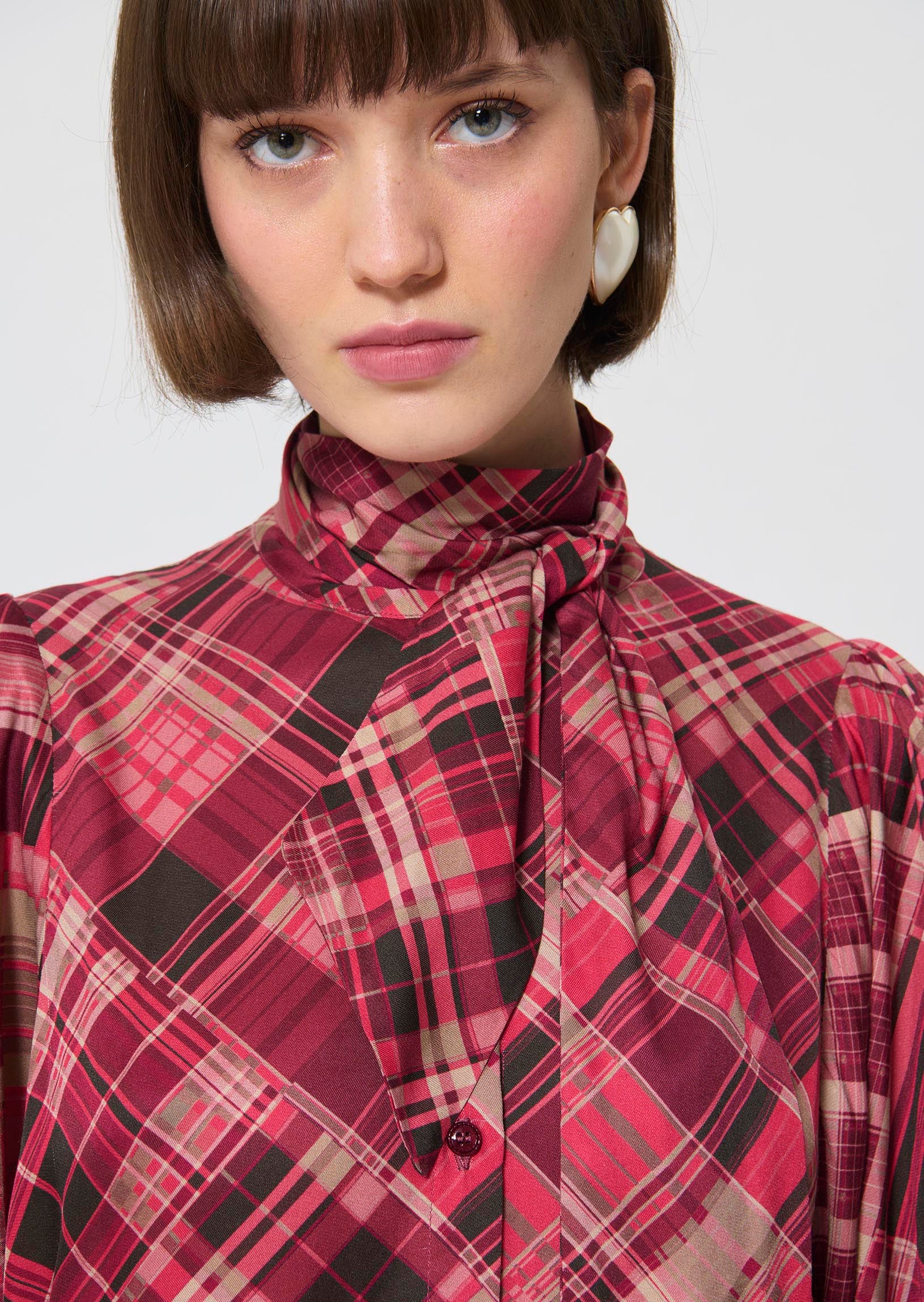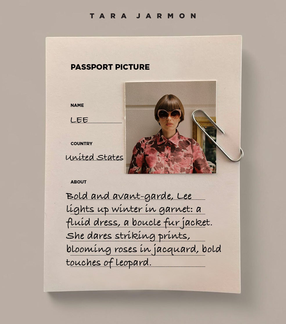 Bold and avant-garde, Lee lights up winter in garnet: a fluid dress, a boucle fur jacket. She dares striking prints, blooming roses in jacquard, bold touches of leopard.
